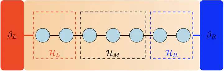 Photo taken from our a draft to be uploaded on arxiv soonThis project is a part of the LTVSP Fellowship done with Dr. Manas Kulkarni from ICTS Bangalore. The first part of this project involved investigating the fundamental limitations of Lindblad-form Quantum Master Equations (QMEs) in modeling open quantum systems. We tested whether a QME can simultaneously be physically consistent (i.e., completely positive and trace-preserving), satisfy local conservation laws, and accurately reproduce the correct non-equilibrium steady state (NESS). To do this, we formulated these desirable properties as a convex optimization problem, solvable using Semidefinite Programming (SDP). This method numerically searches for the “best possible” Lindbladian and returns two metrics, $\tau_{\text{opt}}^{\text{pop}}$ and $\tau_{\text{opt}}^{\text{pop, coh}}$, which are zero if a valid QME exists and non-zero if it is impossible. We applied this framework to XXZ and XX spin chains, specifically comparing systems with one ($N_L=N_R=1$) and two ($N_L=N_R=2$) qubits coupled to thermal baths at different temperatures.
